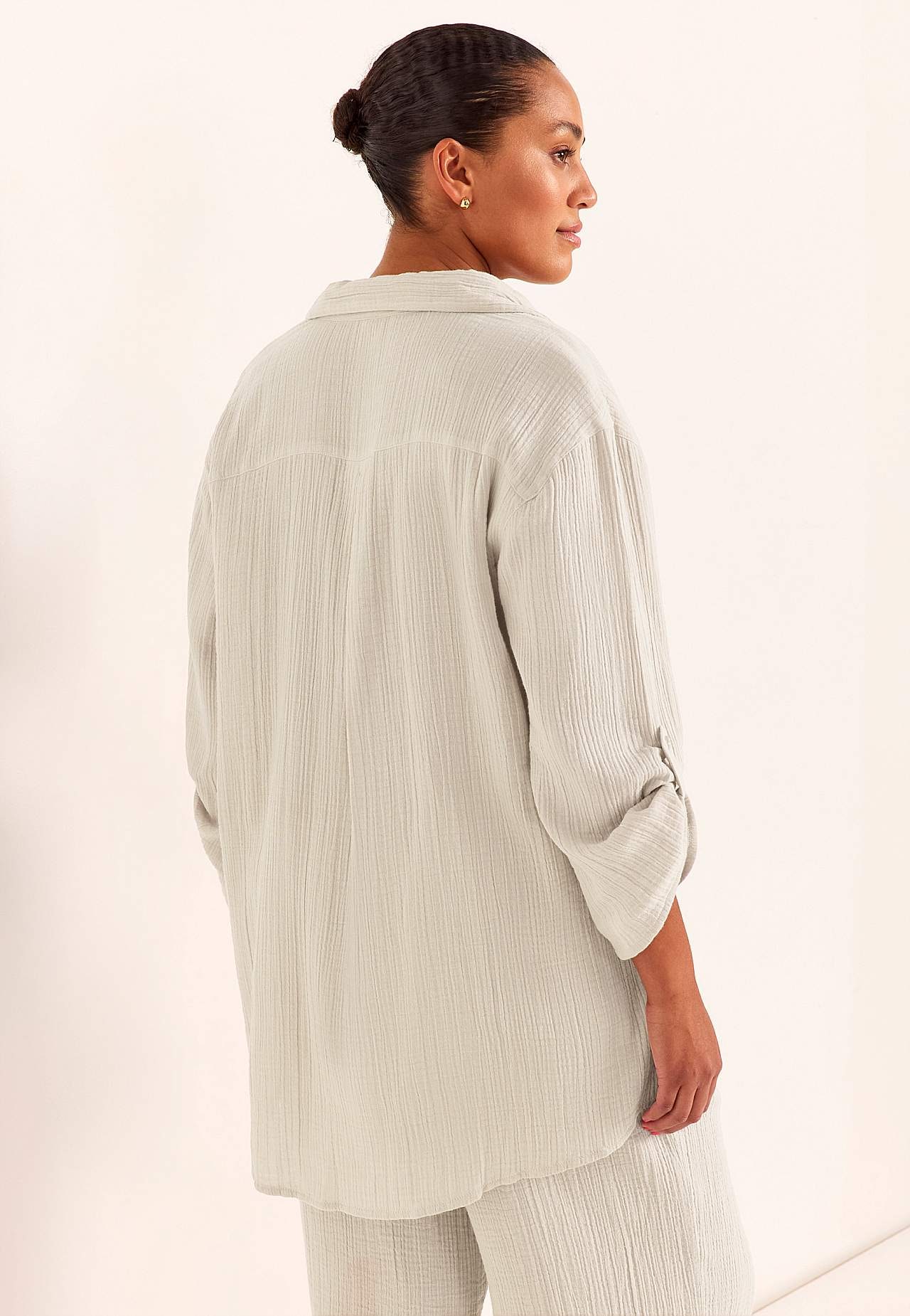 Hemd van mooi en luchtig katoenen gaas met naturel structuur. Model met kraag en knoppen. Oversized pasvorm. Traditionele kraag. Verlaagde schouder. Sluitknoop. Juk en stijlvolle plooi achter. 3/4 mouw met knop met opgerolde mouw. Afgeronde en iets langer aan de achterkant zoom. De lengte varieert afhankelijk van de maat: ... Meer lezen
