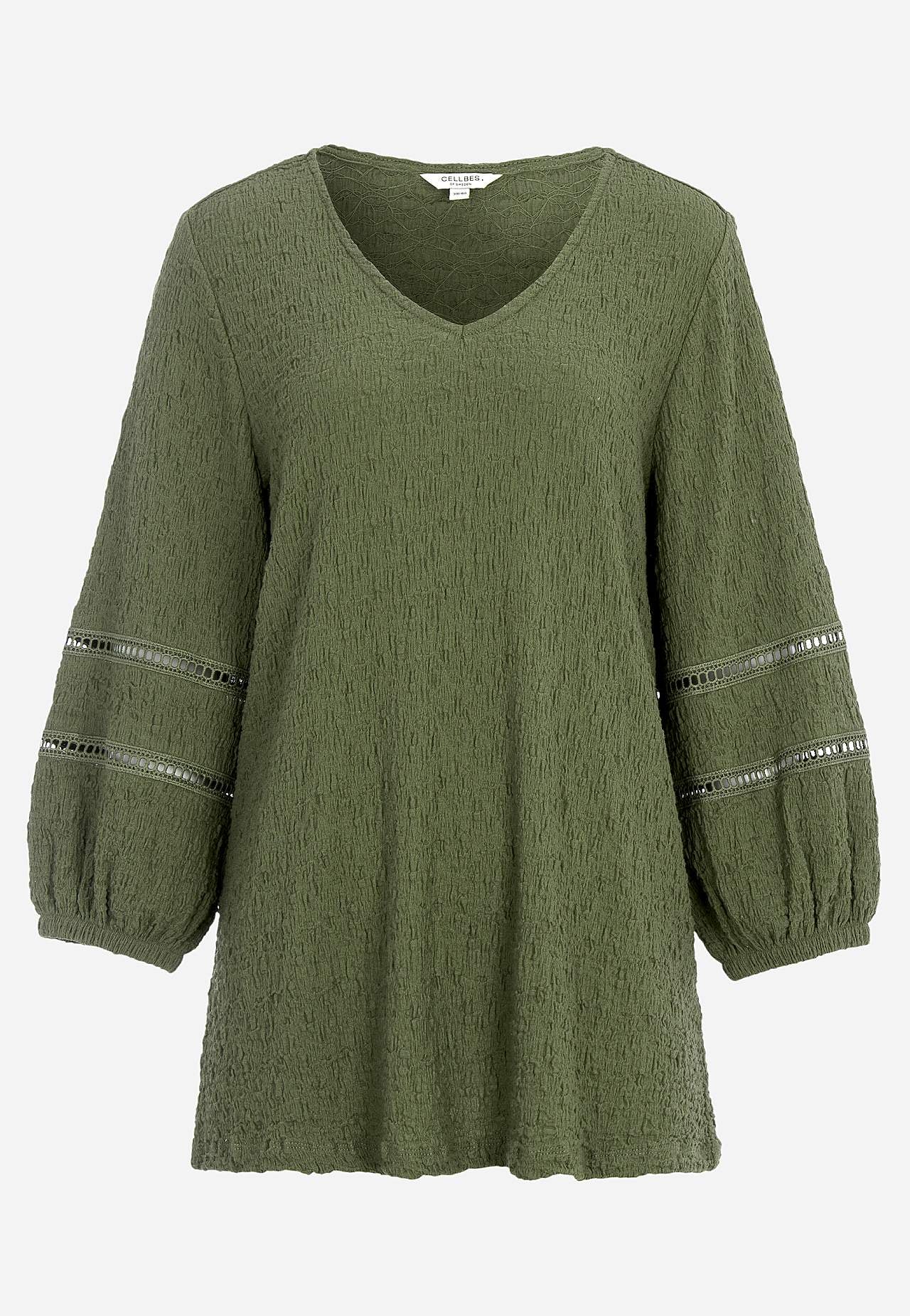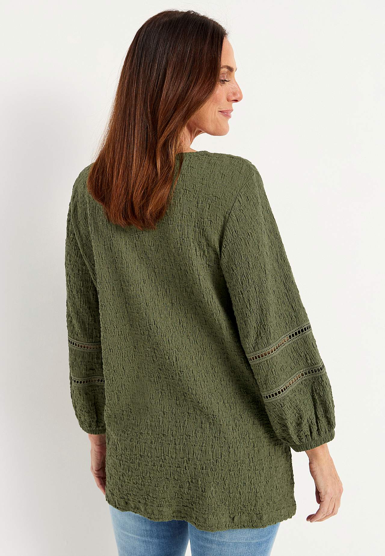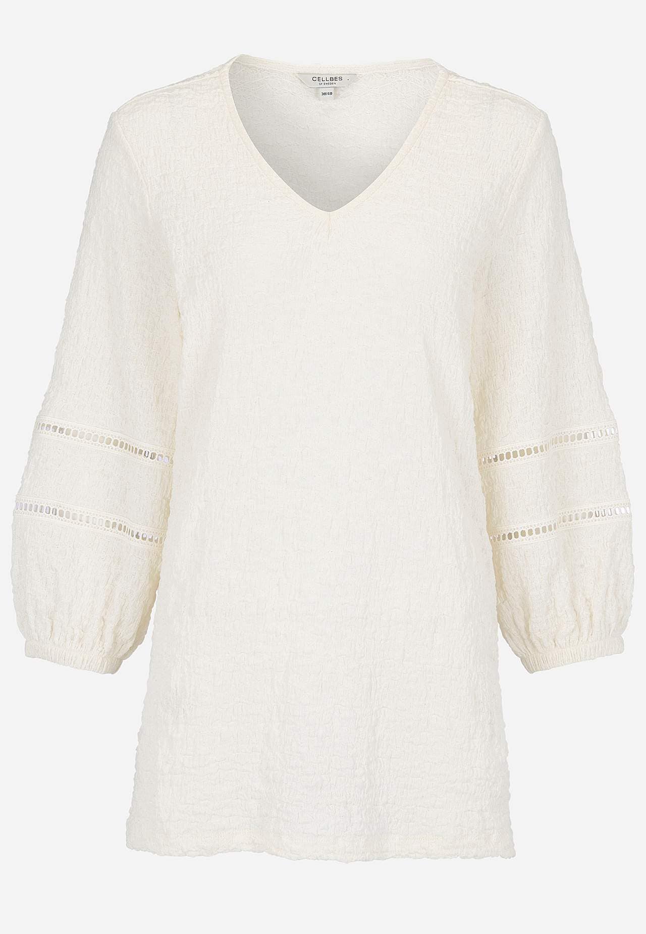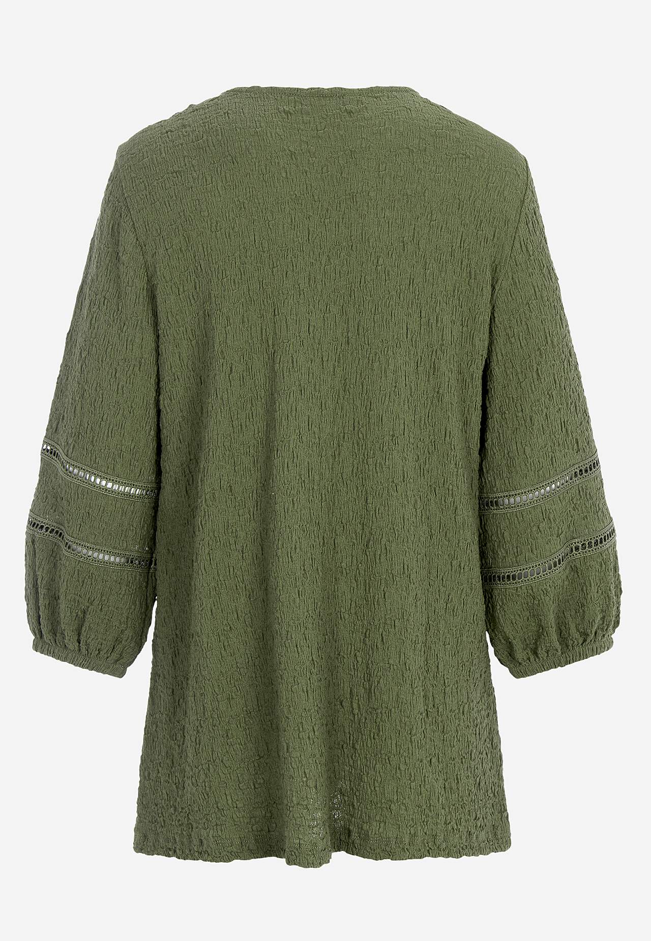 Tuniek van comfortabele en elastische katoenmix met structuur. Mooie details met gatenpatroon op de mouwen. Regular pasvorm met zachtjes afgefakkelde onderkant. Nek met een v-hals. 3/4 lengte en wijde mouwen met elastiek bij de manchetten en decoratieve steken met gatenpatroon. Rechte zoom. De ruglengte varieert per maat: c... Meer lezen