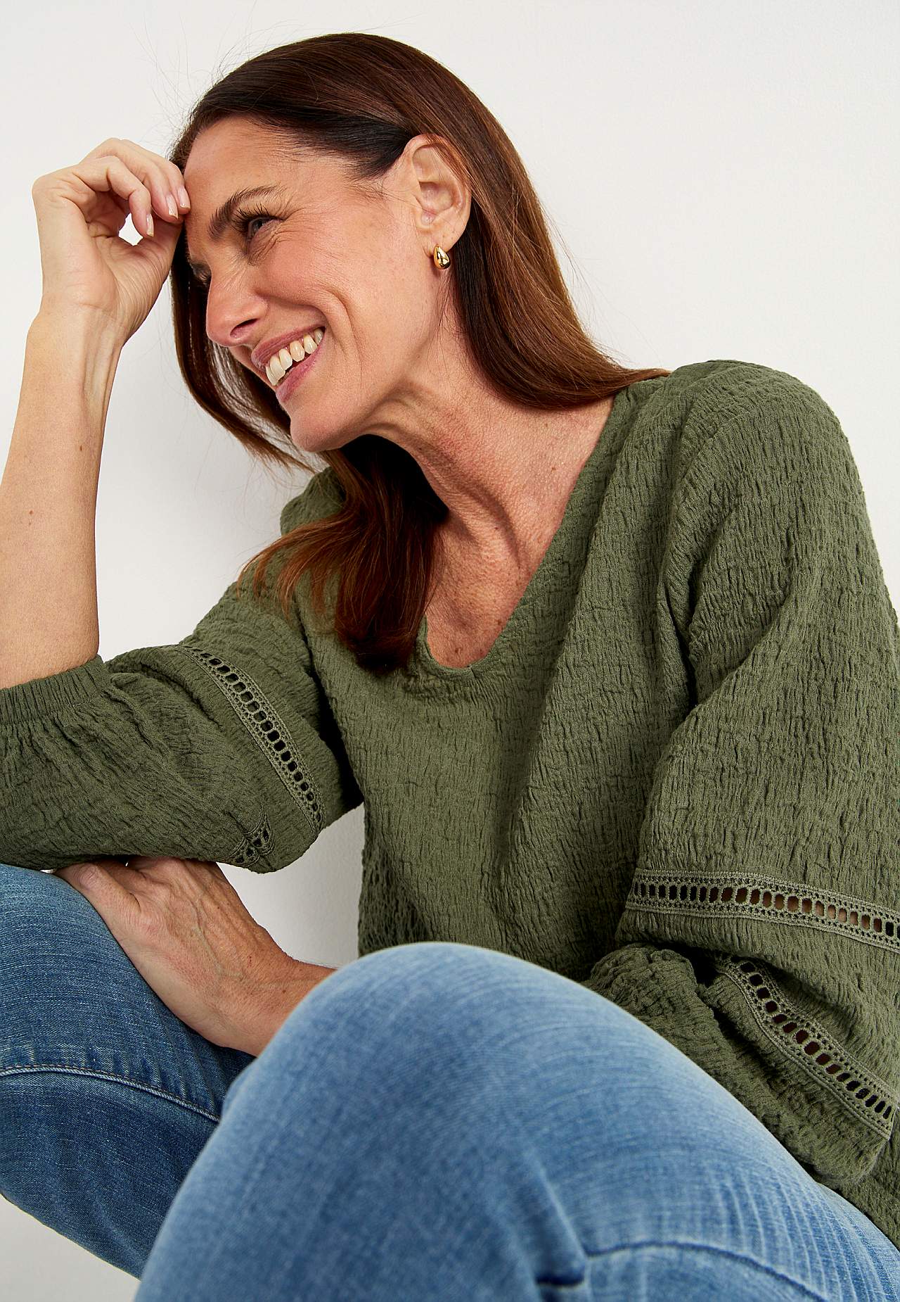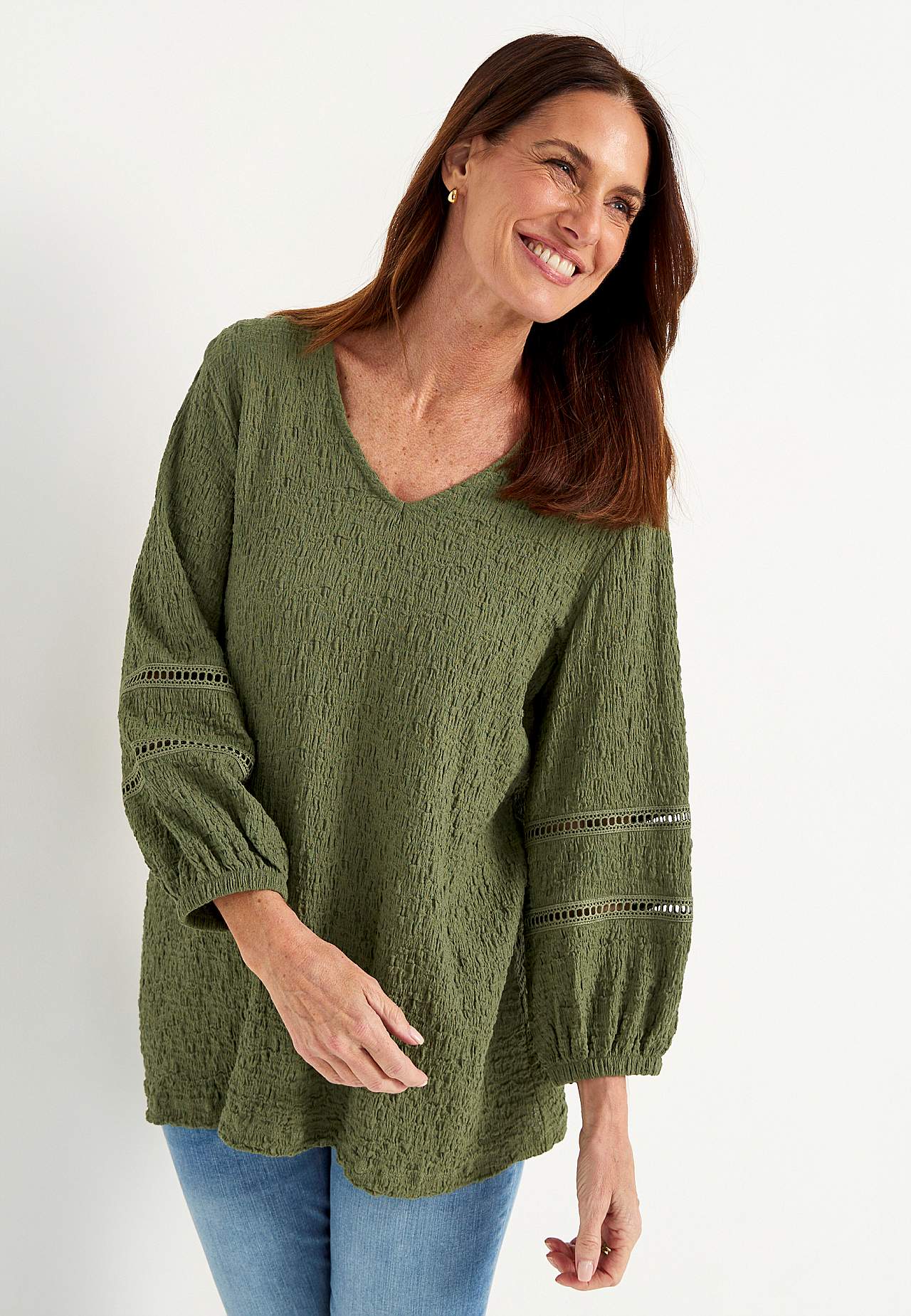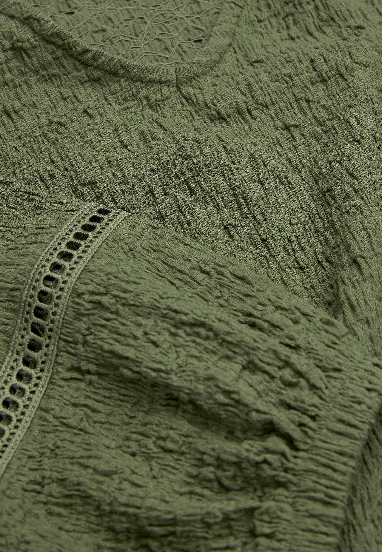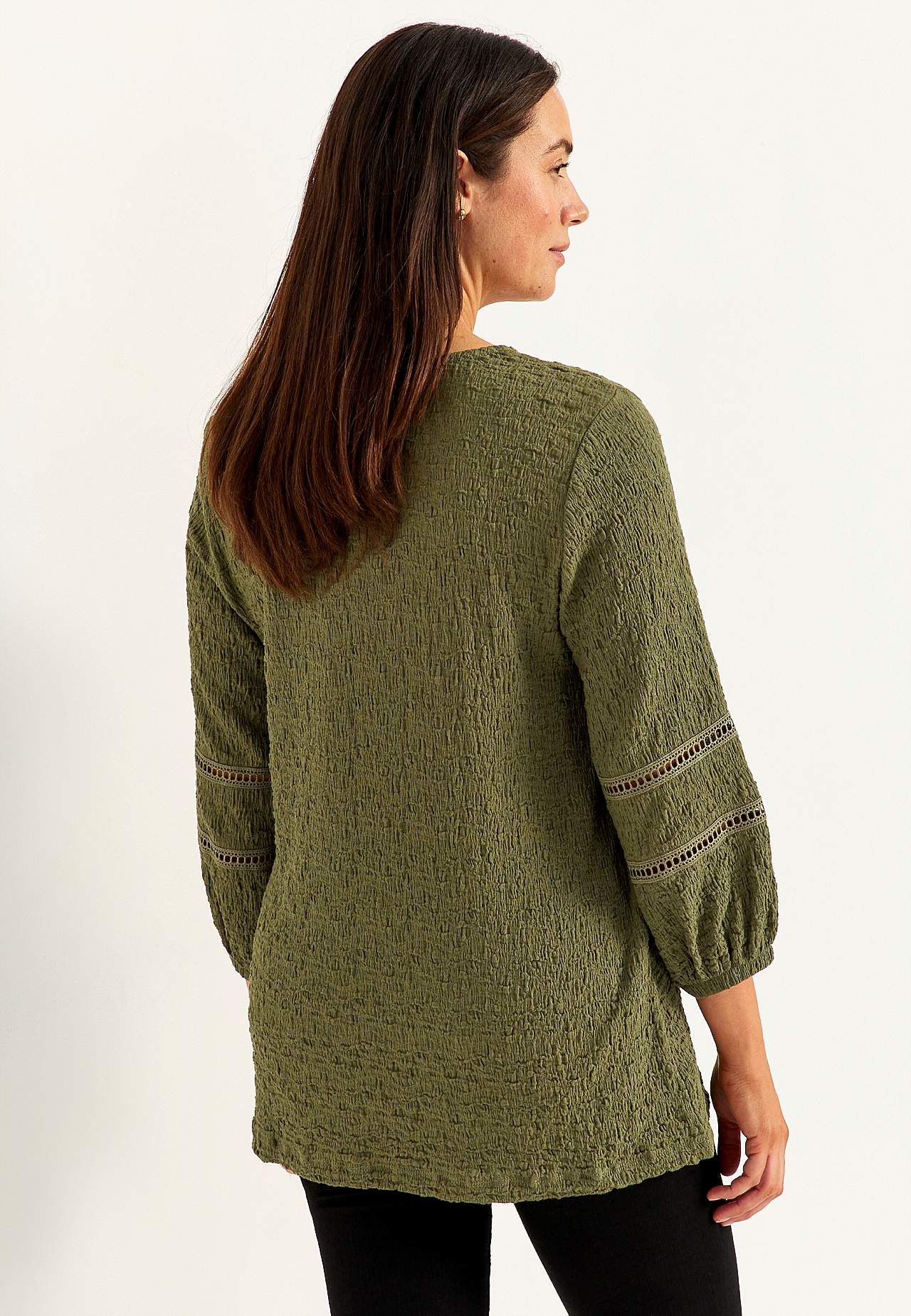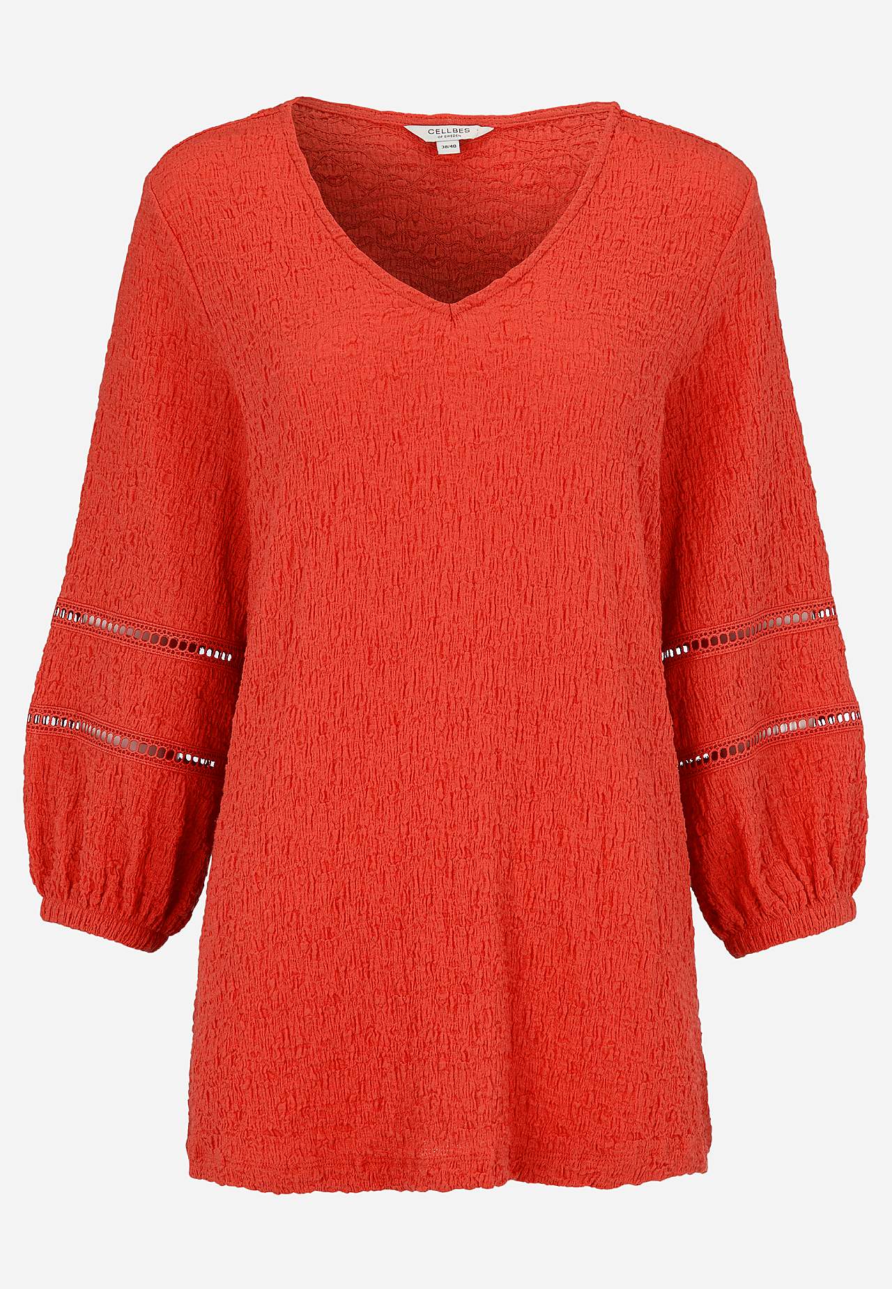 Tuniek van comfortabele en elastische katoenmix met structuur. Mooie details met gatenpatroon op de mouwen. Regular pasvorm met zachtjes afgefakkelde onderkant. Nek met een v-hals. 3/4 lengte en wijde mouwen met elastiek bij de manchetten en decoratieve steken met gatenpatroon. Rechte zoom. De ruglengte varieert per maat: c... Meer lezen