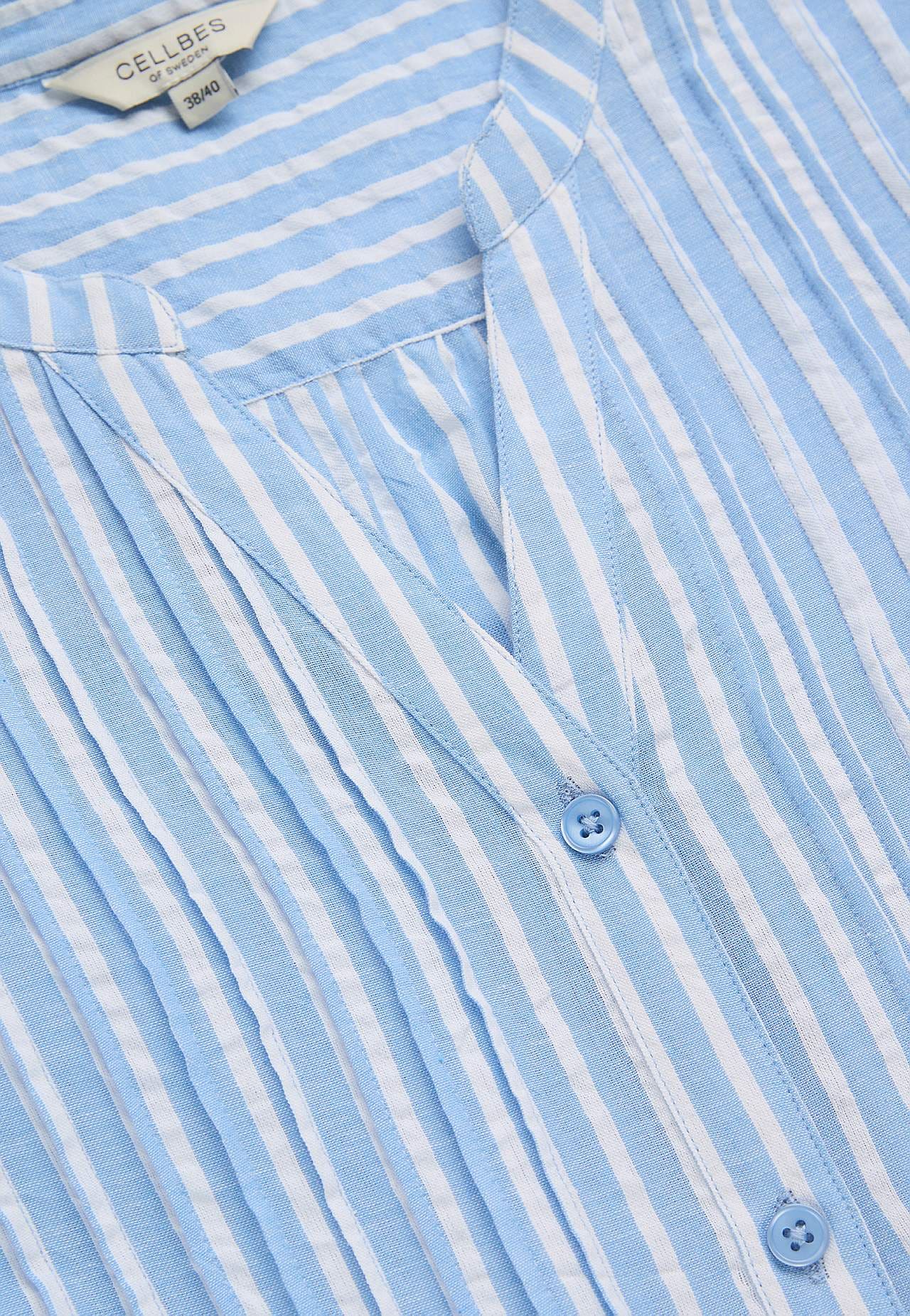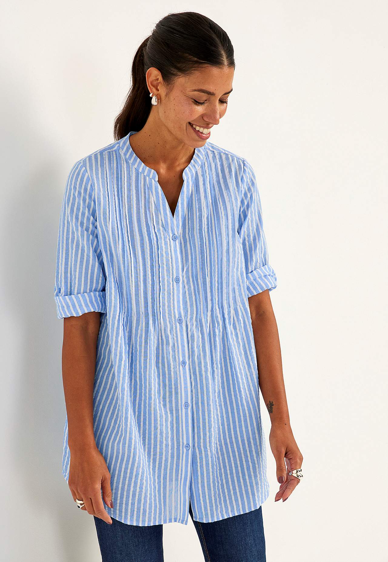Luchtig lang shirt met decoratieve plooien. Mooi materiaal van seersucker. Ronde neklijn met v-vormige opening. Sluitknoop. 3/4 lengte en wijde oprolbare mouw met knoop. Verborgen zakken aan de zijkant. Juk op het achterpand met inrimpelingen. De lengte varieert afhankelijk van de maat: ongeveer 82-94 cm vanaf de schouder.