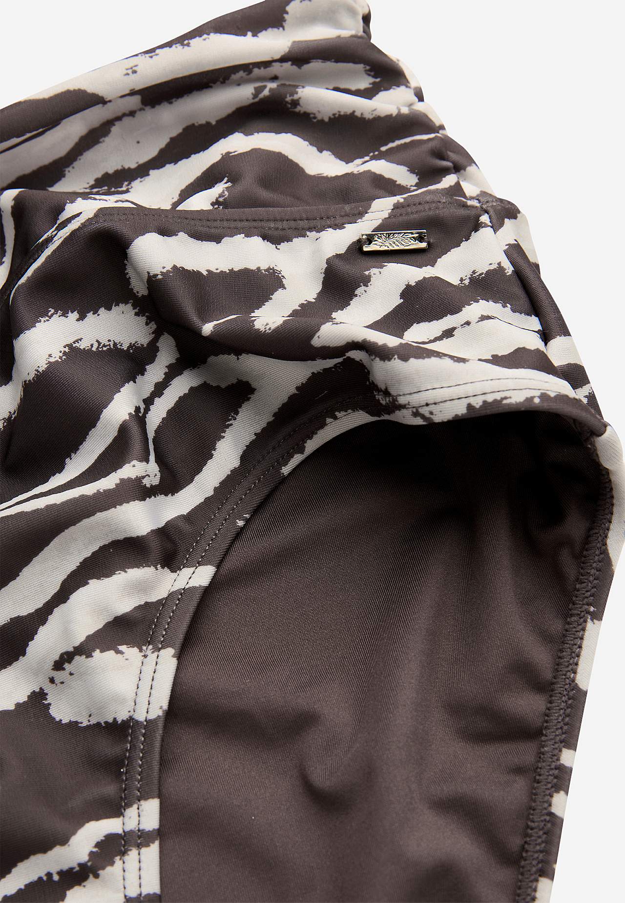 Bikinibroekje van gerecycleerd polyester met patroon. Verstelbare hoogte aan de taille met vouwbare rand perfect voor elke stijl. Inrimpelingen aan de zijnaad. Volledig gevoerde binnenkant zowel aan de voor- als achterkant.