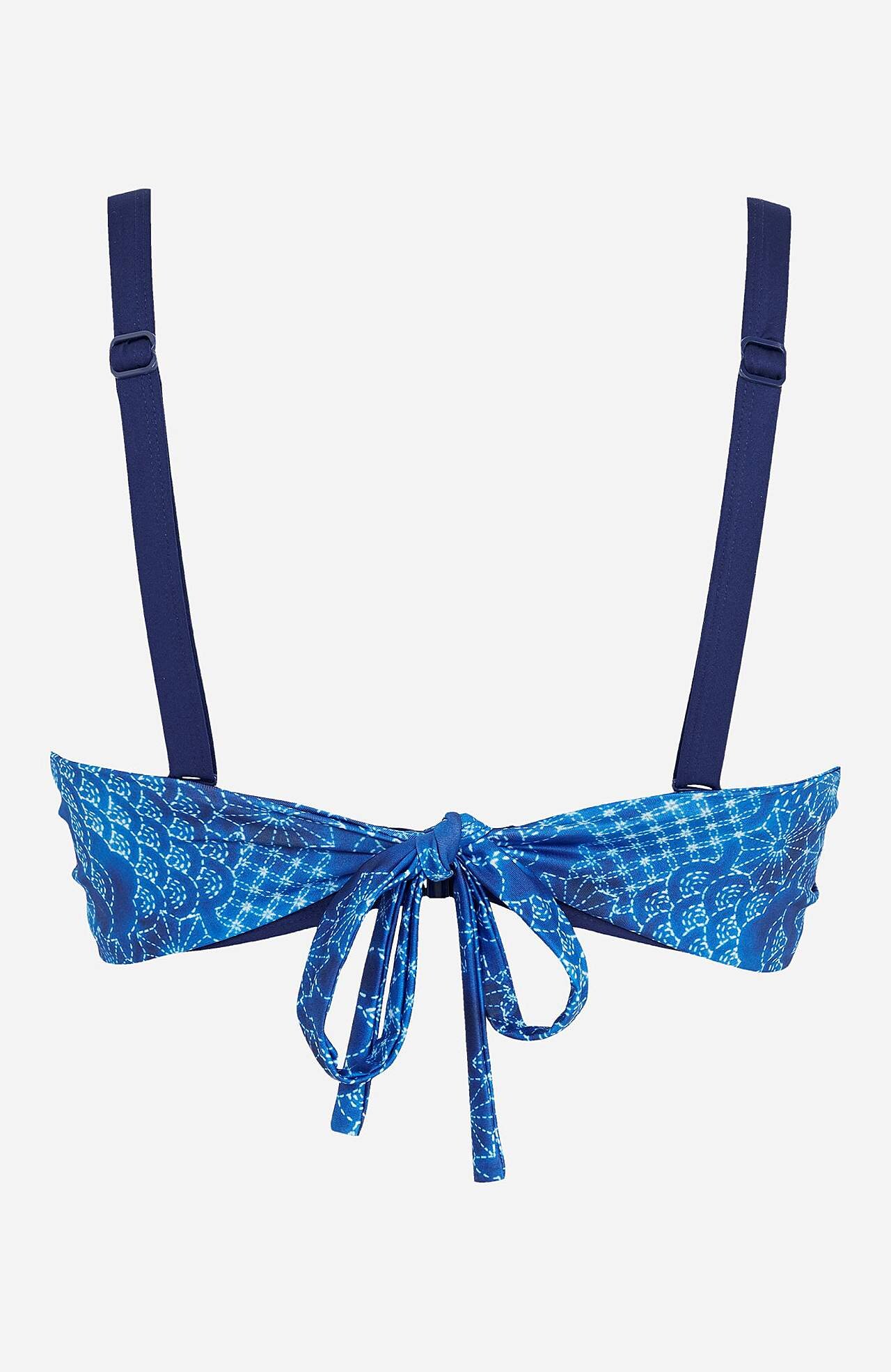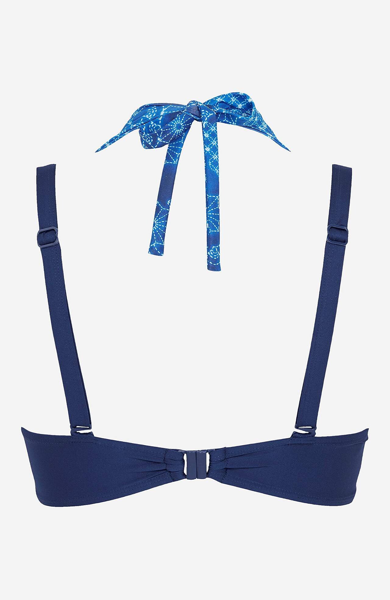 Beugel en gewatteerde cups. Multifunctioneel. Afneembare, verstelbare schouderbandjes die op de rug gekruiste kunnen worden. Breed strikkoord dat rond de hals of de rug kan worden gestrikt. Kunststof sluiting achter. Gemaakt van gerecycled polyester.