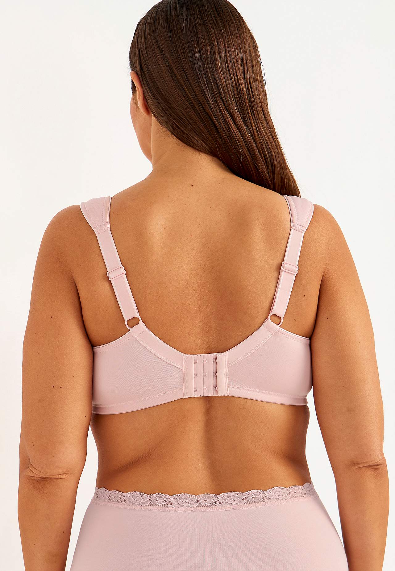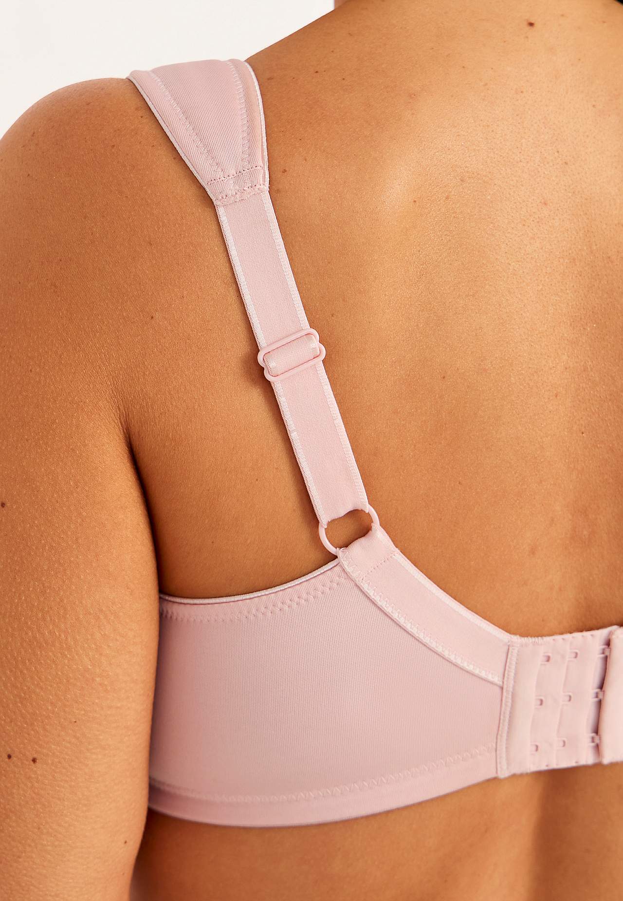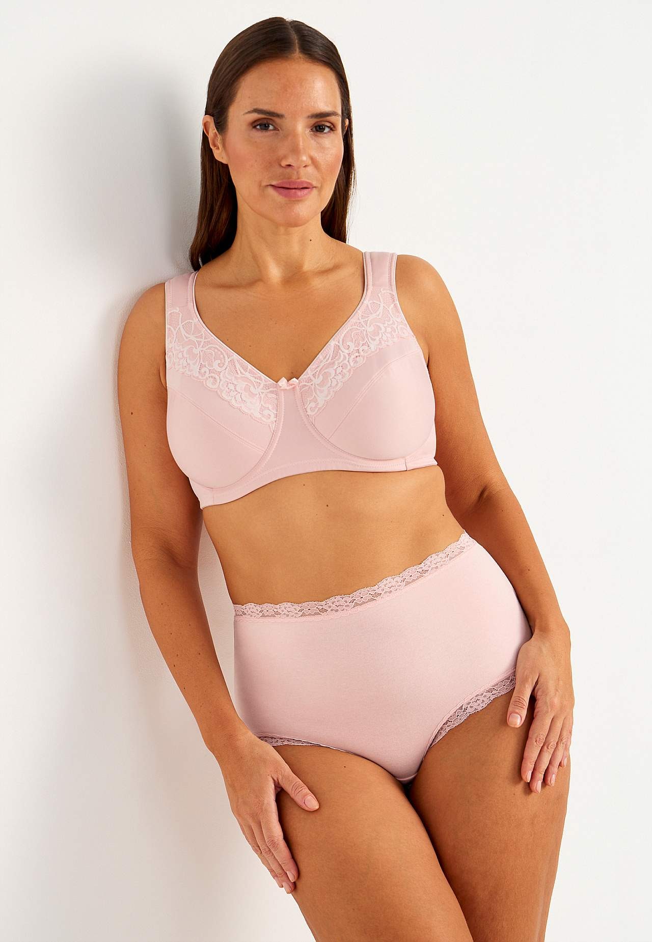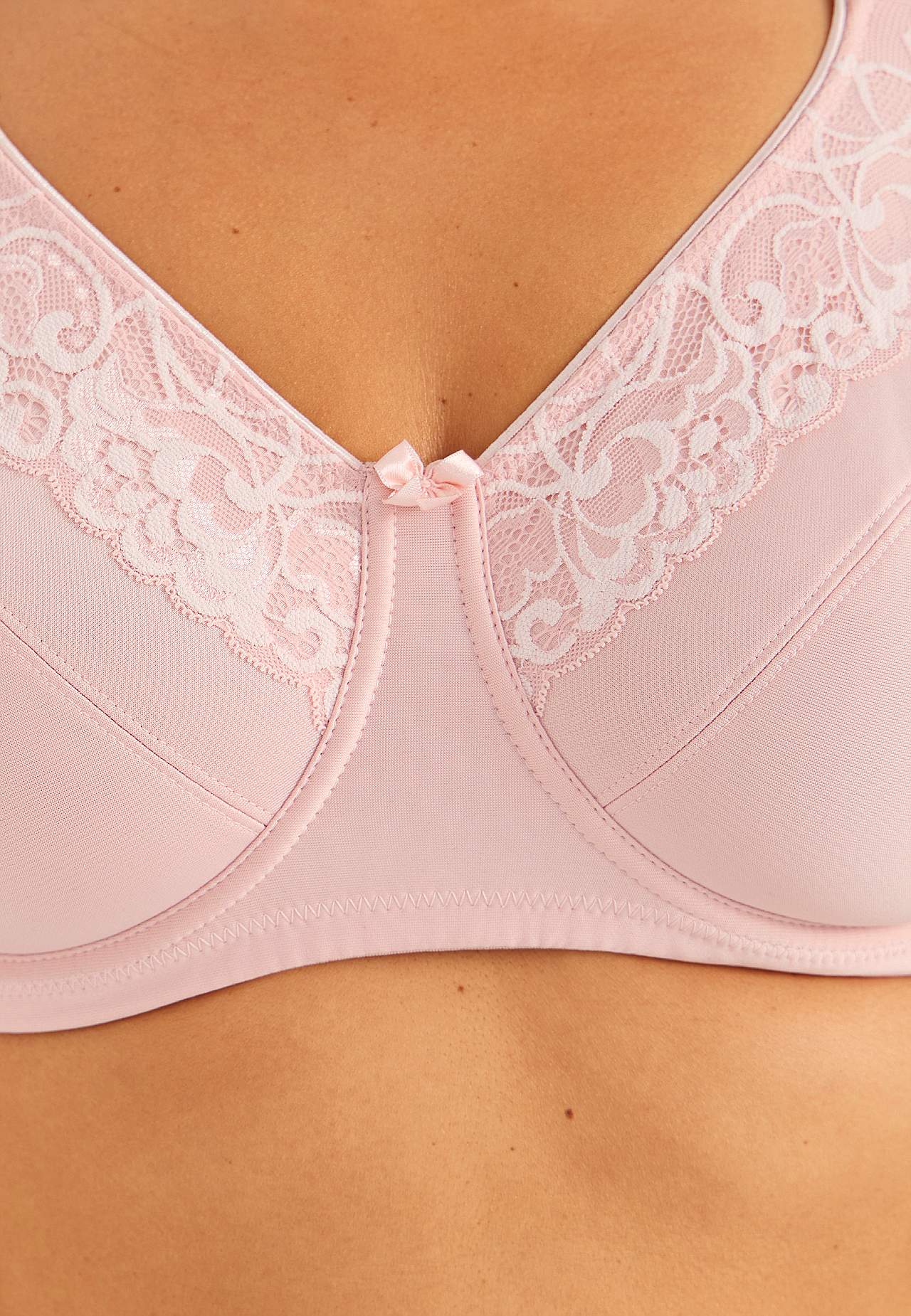 Ongevoerde beugel-bh met mooi en elastisch kant. Gevormde en die een goede busteondersteuning biedt koppen. Bovenkant van de cup met kant aan de bovenkant. Platte cupnaden. Brede en gevoerde aanpasbare schouderbanden. 2-rijige knoopsluiting op de rug, 3-rijige knoopsluiting bij de grotere maten. Discreet klein strikje in to... Meer lezen