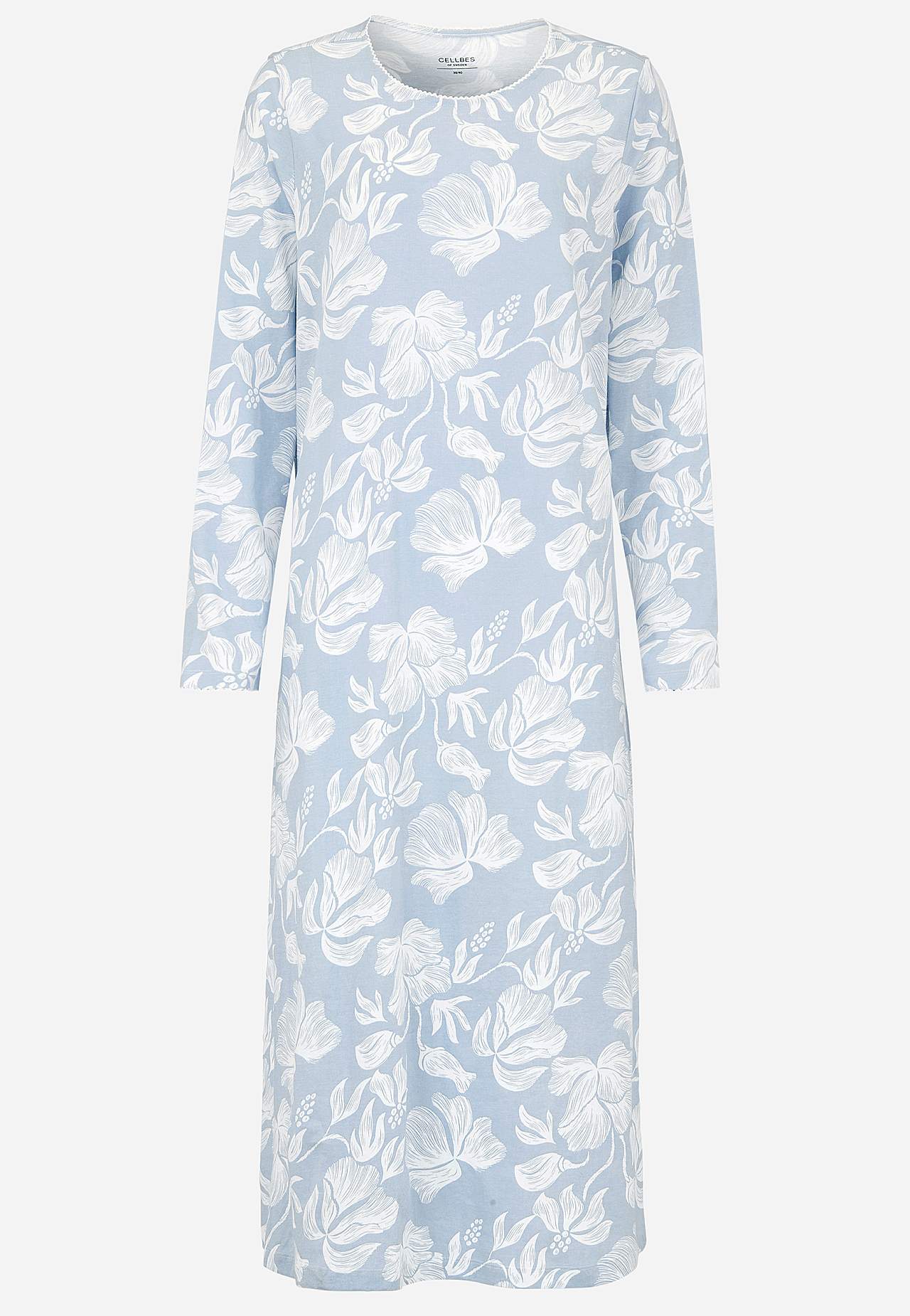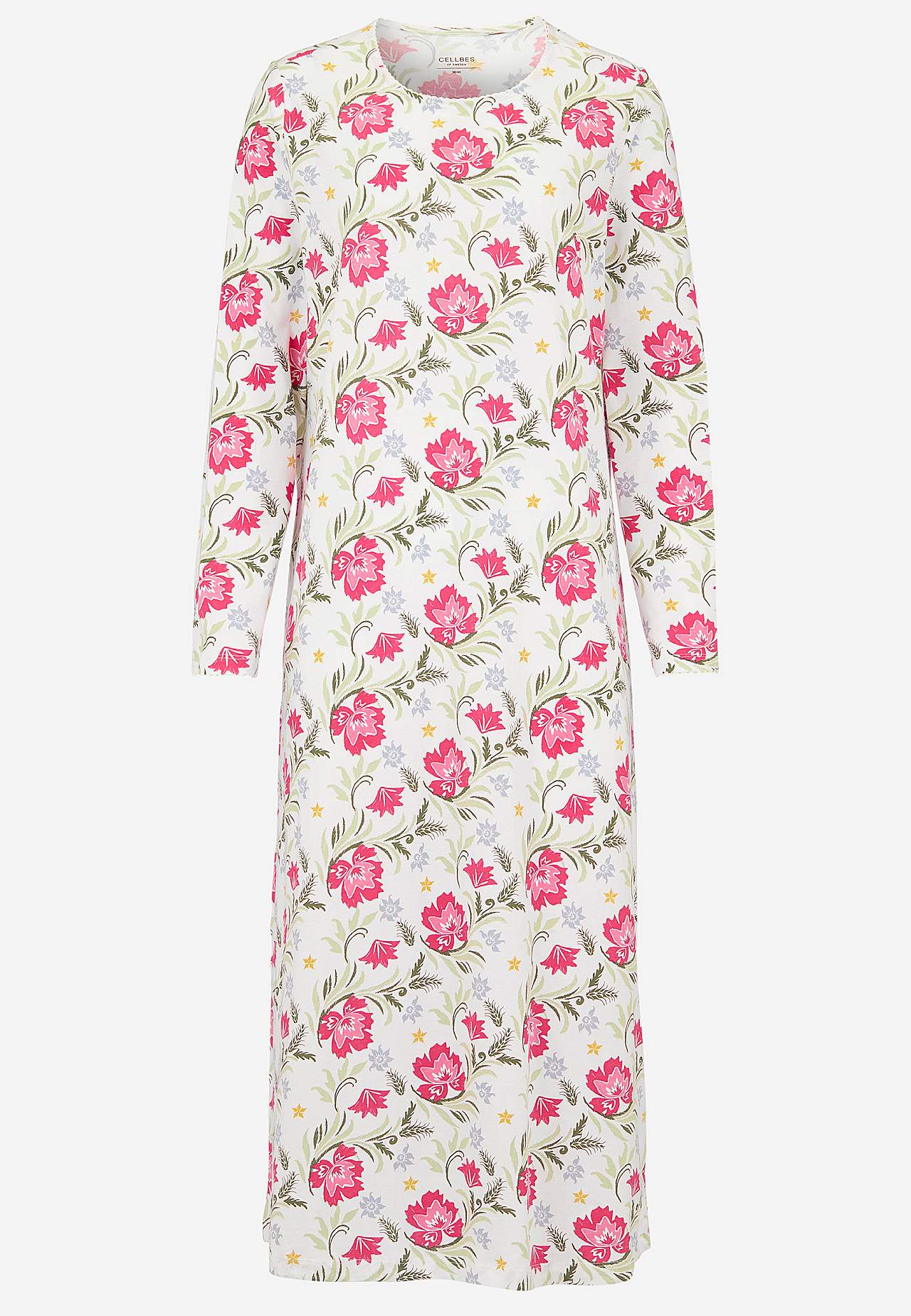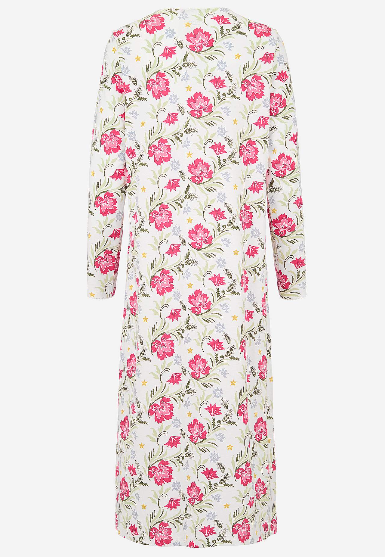 Ronde nek met een mooie kantrand. Lange mouwen met kanten boord bij de manchetten. Rechte zoom. Lengte vanaf de schouder ca. 123 cm in alle maten.