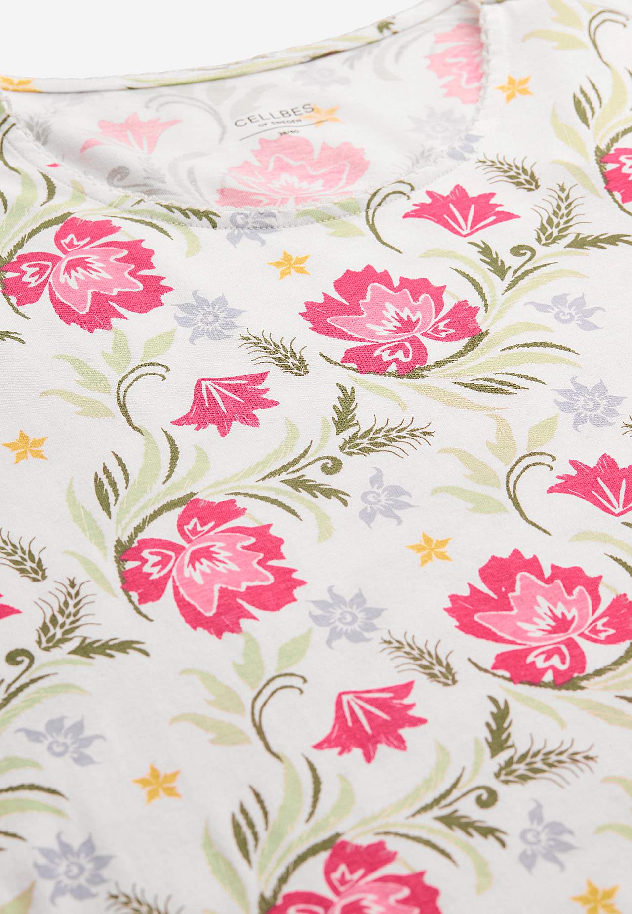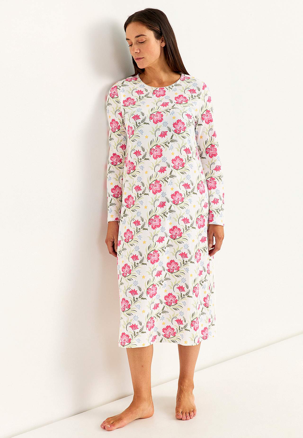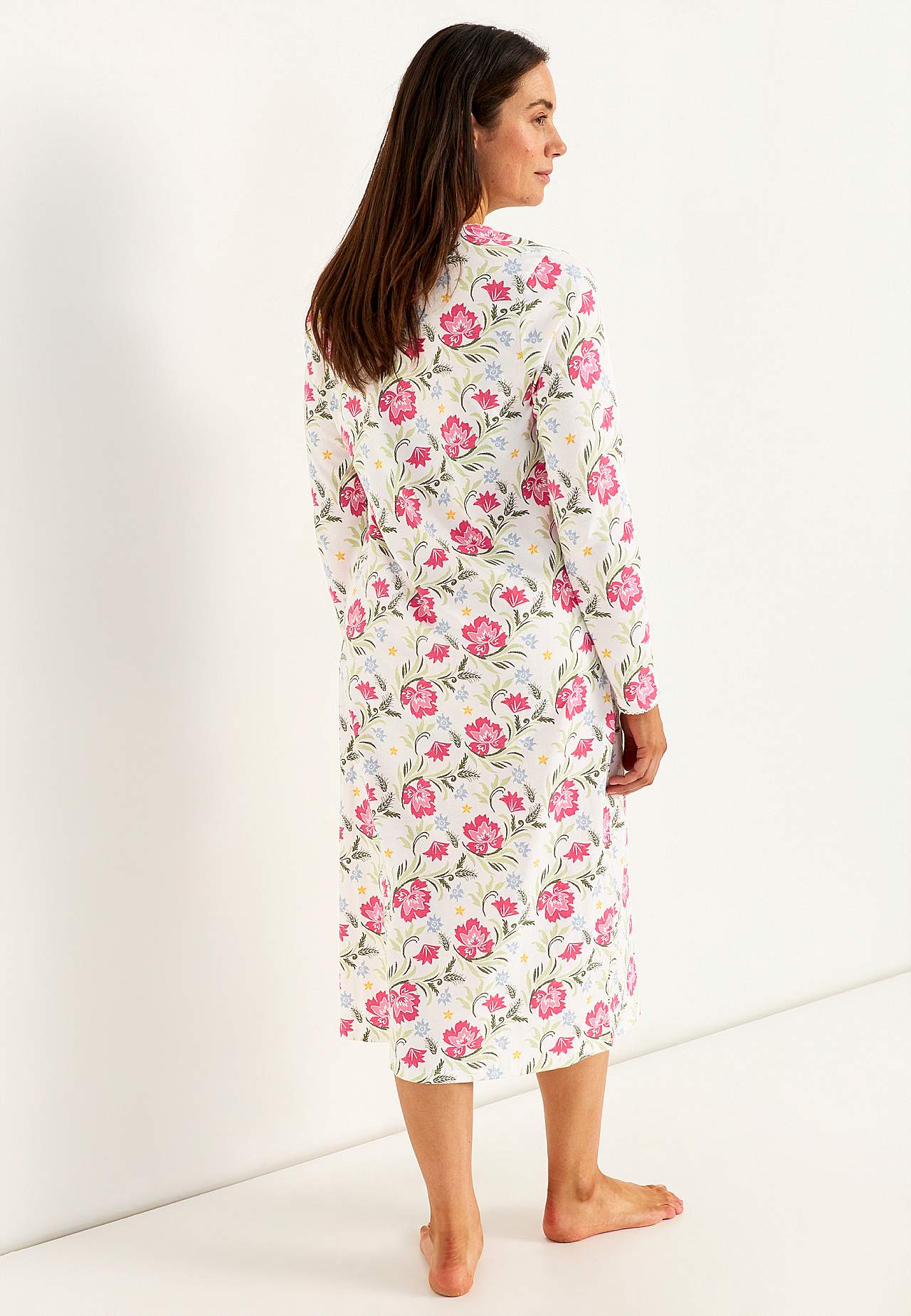 Ronde nek met een mooie kantrand. Lange mouwen met kanten boord bij de manchetten. Rechte zoom. Lengte vanaf de schouder ca. 123 cm in alle maten.